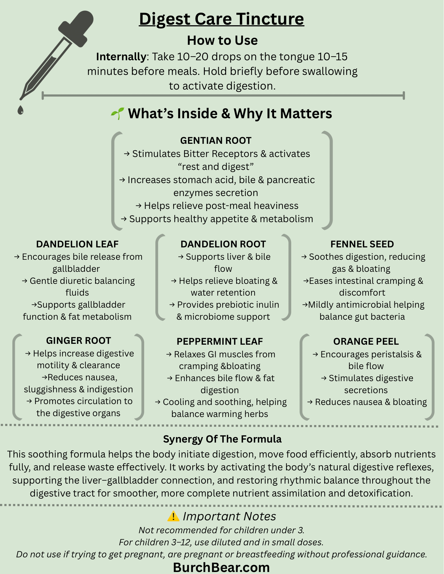 Burch Bear Digest Care is a handcrafted blend of traditional bitter and carminative herbs formulated to awaken the body’s natural digestive rhythm. This complete digestive support formula helps stimulate stomach acid, bile, and enzyme flow while soothing bloating, gas, and sluggish digestion. By combining liver- and gallbladder-supportive herbs with aromatic botanicals, Digest Care promotes smooth motility, efficient nutrient absorption, and balanced gut function after every meal.